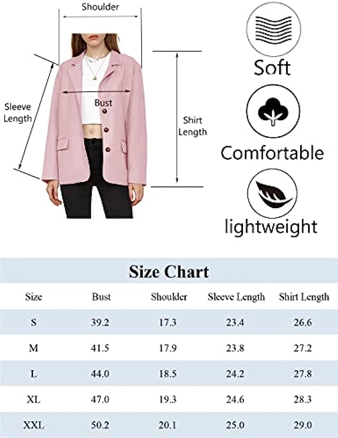 Polyester, Rayon Machine Wash Size Guide: S=US 4-6, M=US 8-10, L=US 12-14, XL=US 16-18. Lightweight and soft fabric, we accept 30 days money back! Material: Women’s blazer jackets are made of polyester and rayon, high-quality fabrication. Soft, comfortable to wear Basic and Stylish Design: women’s blazers with basic lapel collar, long sleeves, padded shoulder, three front button, two functional flap pockets, one decorative chest pockets, solid color, relaxed fit, fully lined. Blazer Jackets suitable for casual wear, business, office, work, meeting, formal / semi formal, night out, going out, etc. Whether paired with a suit or jeans, these blazer outfits for women will give you a fashions modern layered look. Washing Instruction: Machine washable, hand wash cold, air dry, low iron if needed. Note: Because the blazer using the bag packaging, some of them will arrive wrinkled, but don’t worry, it will be flat and cute after washing